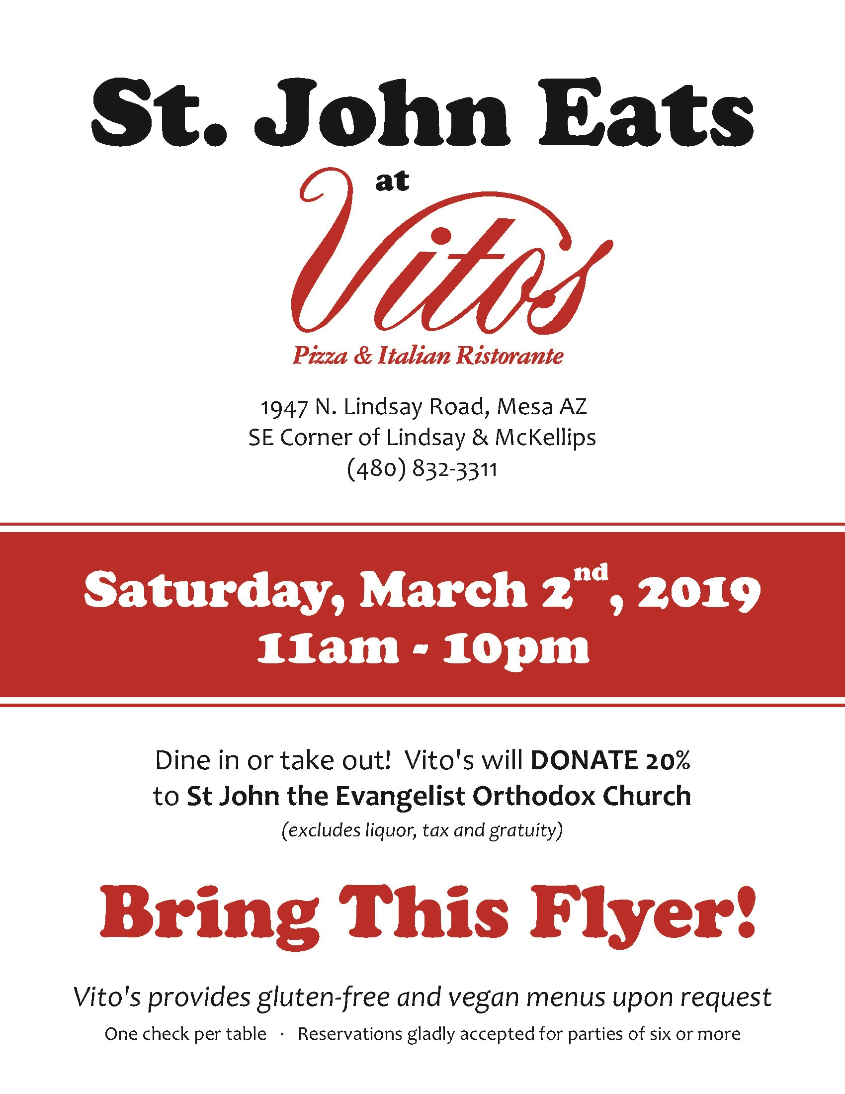 Come and support St. John while enjoying wonderful Italian food! On Saturday 3-2-2019 from 11am to 10pm Vito’s Ristorante in Mesa will generously donate
